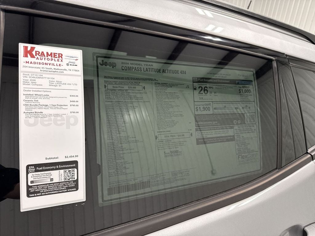 Discover the 2026 Jeep Compass Latitude Altitude 4WD, now available in Madisonville, TX — a compact SUV that blends capability, comfort, and modern safety features at the best price. Powered by a responsive 2.0L 4-cylinder gasoline engine, this Jeep Compass delivers efficient performance for daily commutes and weekend adventures, while the 4WD system provides confident handling on wet roads and light off-road trails. Inside, the Latitude Altitude trim offers a refined cabin with driver-focused amenities. Stay connected with Hands-Free Bluetooth® for seamless calls and audio streaming, and enjoy entertainment on the go with Satellite Radio. Cold mornings are no problem thanks to the Heated Steering Wheel that adds comfort to every drive. Safety is prioritized with Forward Collision Warning and a Back-Up Camera to help prevent incidents and make parking easier in tight spots. This Jeep Compass balances style and substance with a bold exterior design, versatile cargo space, and user-friendly technology — ideal for families, professionals, and outdoor enthusiasts. Located in Madisonville, TX, this vehicle is competitively priced to offer exceptional value. Contact us today to schedule a test drive and experience the performance, safety features, and convenience of the 2026 Jeep Compass Latitude Altitude 4WD for yourself. Secure the best price on this well-equipped SUV before it's gone.