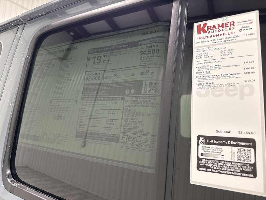2026 Jeep Gladiator Texas Trail 4WD with the dependable 3.6L V6 gasoline engine — located in Madisonville, TX — offers rugged capability, refined comfort, and exceptional value. This Jeep Gladiator Texas Trail combines off-road-ready features with street-smart technology, making it ideal for weekend adventures or daily driving. With four-wheel drive and a muscular V6, towing and trail performance are confident and composed. Premium leather seats and a heated steering wheel provide a comfortable, upscale cabin for every season, while Remote Start adds convenience on chilly mornings or hot afternoons. Safety-focused Forward Collision Warning helps keep you aware of changing traffic conditions, and Hands-Free Bluetooth® keeps you connected without taking your focus off the road. The interior balances durability and comfort with thoughtful storage and user-friendly controls. Exterior enhancements and trail-ready suspension help the Jeep Gladiator handle rough terrain without sacrificing on-road manners. Located in Madisonville, TX, this Jeep Gladiator Texas Trail is competitively priced to be the best value in the area. Whether you need a capable work truck, a weekend trail companion, or a comfortable daily driver, this Jeep delivers versatility and confidence. Contact us to schedule a test drive in Madisonville and experience why this Jeep Gladiator offers the best price for the features and capability you want.