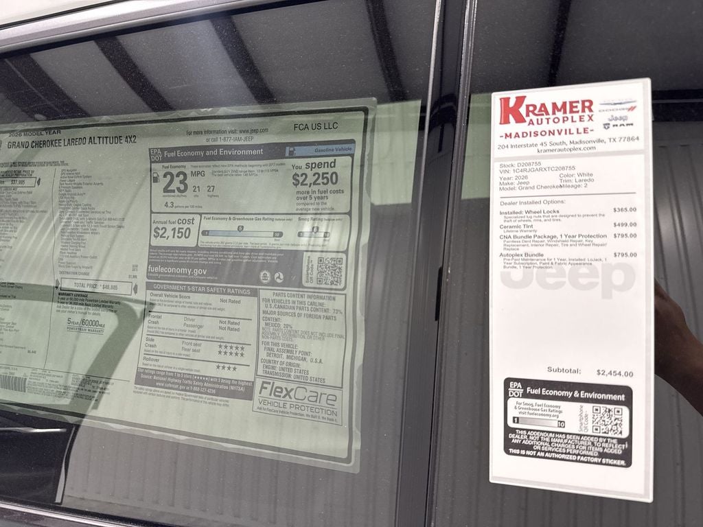 2026 Jeep Grand Cherokee Laredo Altitude — RWD, 4‑Cylinder 2.0L Gasoline — Madisonville, TX Discover exceptional value with this 2026 Jeep Grand Cherokee Laredo Altitude, ideally located in Madisonville, TX. Powered by a responsive 4-cylinder 2.0L gasoline engine and rear-wheel drive, this Jeep Grand Cherokee delivers confident handling, strong fuel efficiency, and a comfortable ride for daily commutes or weekend adventures. This model offers premium features and tech designed for convenience and safety at the best price in the area. Key features include Hands-Free Bluetooth® for seamless calling and audio streaming, integrated Navigation to keep you on course, and a Back-Up Camera to simplify parking and tight maneuvers. Enjoy premium comfort with Leather Seats that elevate every drive, plus Adaptive Cruise Control for relaxed highway travel and enhanced safety. The Laredo Altitude trim blends refined style with practical functionality, making it a versatile choice for families and drivers who expect more from their SUV. Located in Madisonville, TX, this Jeep Grand Cherokee is competitively priced to ensure it's the best deal available without sacrificing features or quality. Contact us to schedule a test drive, verify availability, and lock in this exceptional offer before someone else does. Drive away in confidence and value today.