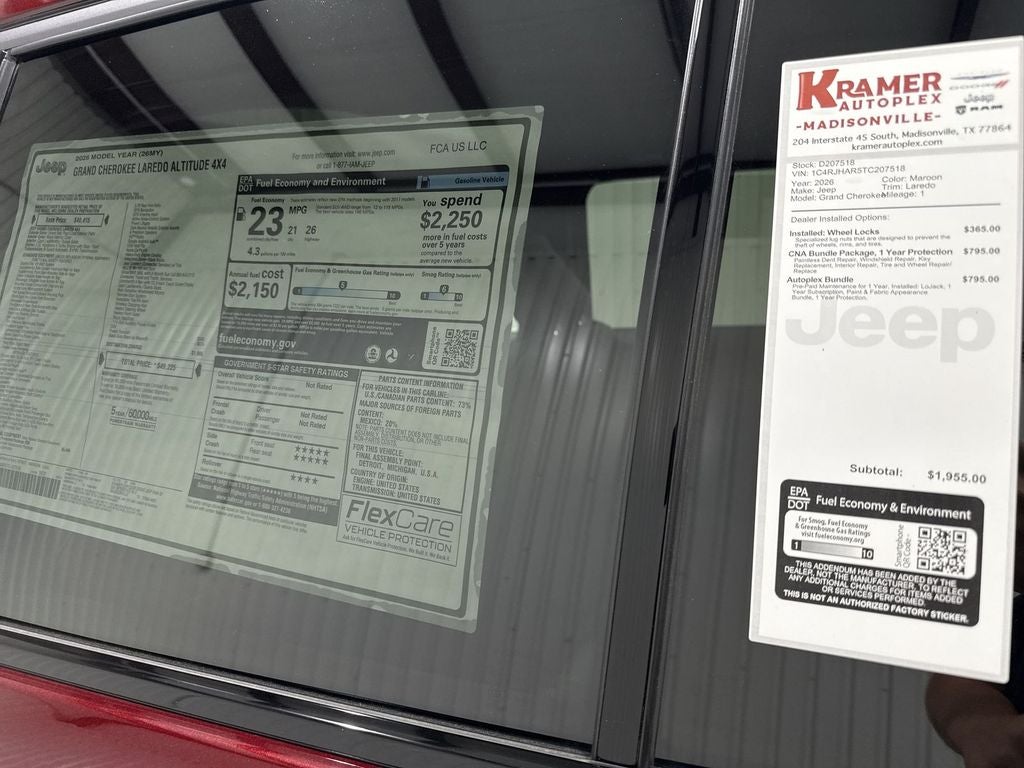 Discover unbeatable value with this 2026 Jeep Grand Cherokee Laredo Altitude 4WD, now available in Madisonville, TX. Combining rugged capability and refined comfort, this Jeep Grand Cherokee features a fuel-efficient 4-cylinder 2.0L gasoline engine that delivers confident performance on highways and trails. With four-wheel drive and advanced traction systems, it's ready for Texas weather and weekend adventures. This Laredo Altitude edition stands out with premium leather seats that provide long-distance comfort and a commanding interior feel. Stay connected and entertained with Apple CarPlay and Android Auto integration, plus factory Navigation to guide you wherever you go. Enjoy the convenience of Remote Start for those hot Texas mornings and cool evenings. Exterior styling blends athletic presence with modern cues, while the well-appointed cabin includes intuitive controls and quality materials. Safety and driver assistance features are thoughtfully integrated to help protect you and your passengers on every drive. Whether commuting or exploring rural back roads, this Jeep Grand Cherokee balances efficiency and capability without compromise. Located in Madisonville, TX, this 2026 Jeep Grand Cherokee Laredo Altitude is competitively priced — the best price available in the area. Don't miss your chance to own a stylish, capable SUV that checks all the boxes for tech, comfort, and performance. Schedule a test drive today and experience this Jeep Grand Cherokee for yourself — superior value awaits.
