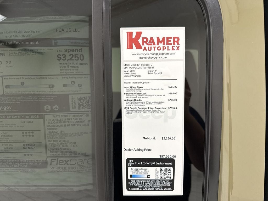 Discover adventure in this 2026 Jeep Wrangler Sport S 4WD, now available in Livingston, TX — priced to sell and offering the best value on the market. Built for weekend explorers and daily commuters alike, this rugged yet refined Jeep Wrangler pairs a responsive 4-cylinder 2.0L gasoline engine with confident 4WD capability to tackle highways, backroads, and trails with ease. Inside, modern tech keeps you connected and comfortable: Apple CarPlay and Android Auto integration allow seamless smartphone access for navigation and media, while adaptive cruise control reduces stress on long drives. The heated steering wheel adds a premium touch for chilly mornings, and rear parking sensors help you maneuver into tight spots with confidence. This Sport S model blends Jeep's legendary off-road DNA with practical features for everyday life. It's equipped to handle unpredictable weather and rough terrain, yet remains efficient and easy to drive around town. Safety-minded drivers will appreciate the advanced driver assist features that enhance awareness without getting in the way. Located in Livingston, TX, this Jeep Wrangler Sport S represents exceptional value with the best price in the area. If you're searching for a versatile, capable SUV that delivers style, technology, and off-road readiness, this 2026 Jeep Wrangler Sport S is ready for your next journey. Contact us to schedule a test drive and experience it for yourself.