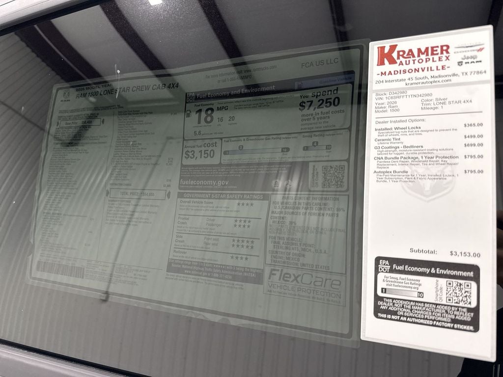2026 Ram 1500 Lone Star 4WD with the legendary 5.7L V8 — located in Madisonville, TX — combines rugged capability, refined comfort, and the best price you'll find. This powerhouse truck delivers confident towing and effortless highway cruising while the 4WD system keeps you steady on mud, gravel, or wet roads. The Lone Star trim adds thoughtful touches and durable finishes that suit both work sites and weekend adventures. Inside, modern tech and convenience surround you: Android Auto keeps your apps and navigation seamless, Hands Free Bluetooth® makes calls and streaming simple, and Remote Start warms or cools the cabin before you climb in. Adaptive Cruise Control reduces fatigue on long drives by maintaining safe following distances, and Rear Parking Sensors assist precise maneuvering in tight spots. Every detail of this Ram 1500 is designed for daily usability — roomy seating, smart storage, and a capable bed ready for hauling gear. Safety and driver aids are built-in to enhance confidence behind the wheel. Located in Madisonville, TX, this Ram 1500 Lone Star is competitively priced and represents exceptional value — the best price available for this combination of V8 power, 4WD capability, and premium features. Act now to experience the muscular performance and modern amenities of this 2026 Ram 1500 Lone Star. Contact us in Madisonville, TX to schedule a test drive and secure this outstanding offer.
