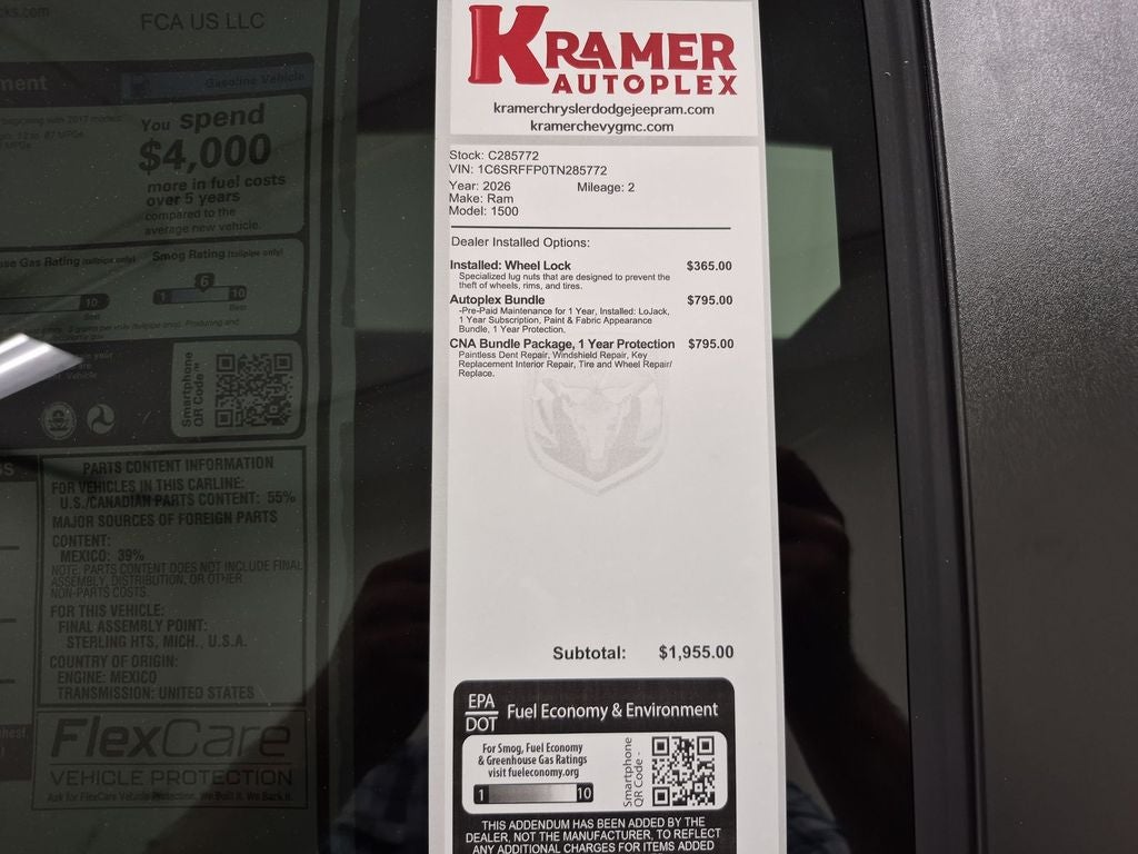 This 1/2 ton pickup's Forward Collision Warning feature alerts drivers to potential front-end collisions. This 2026 Ram 1500 has auto-adjust speed for safe following. The vehicle offers Android Auto for seamless smartphone integration. This model is equipped with the latest generation of XM/Sirius Radio. The satellite radio system in this unit gives you access to hundreds of nation-wide radio stations with a clear digital signal. Keep your hands warm all winter with a heated steering wheel in this unit . Never get into a cold vehicle again with the remote start feature on this model. Apple CarPlay: Seamless smartphone integration for this Ram 1500 - stay connected and entertained on the go! The state of the art park assist system will guide you easily into any spot. See what's behind you with the back up camera on it. Bluetooth® technology is built into the vehicle, keeping your hands on the steering wheel and your focus on the road.