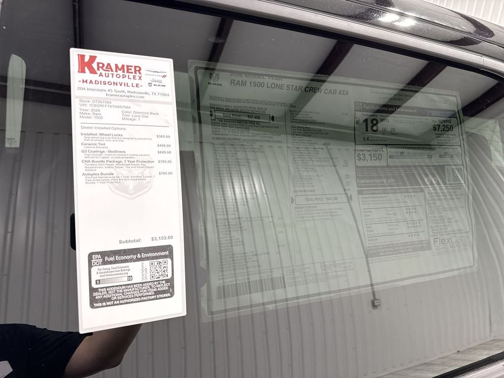 Find exceptional capability and comfort with this 2026 Ram 1500 Lone Star 4WD, now available in Madisonville, TX. Powered by a robust 5.7L V8 gasoline engine, this truck balances strong towing and hauling performance with refined on-road manners. The Lone Star trim pairs rugged exterior styling and practical features ideal for Texas roads and work sites. Safety and driver assistance technologies are thoughtfully integrated, including Forward Collision Warning and Adaptive Cruise Control to help maintain safe spacing and reduce driver fatigue on long drives. Stay connected with Apple CarPlay and Android Auto for seamless smartphone integration, and enjoy the convenience of Remote Start to pre-condition the cabin on hot or cold days. The 4WD system provides extra traction and confidence when the terrain or weather demands it. Inside, the Ram 1500 Lone Star delivers comfortable seating and a user-friendly layout, making every commute or jobsite run more enjoyable. Cargo and bed space are optimized for utility, and the durable interior materials stand up to heavy use without sacrificing style. Located in Madisonville, TX, this 2026 Ram 1500 Lone Star offers the best price in the area—built for performance, comfort, and value. Contact us today to schedule a test drive and experience why this Ram 1500 is the right choice for drivers seeking power and modern technology in a capable 4WD truck.