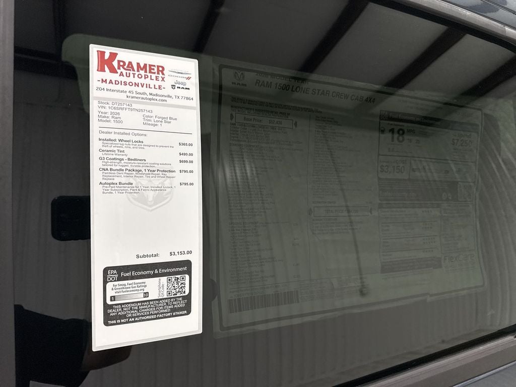 Discover the 2026 Ram 1500 Lone Star 4WD with a powerful 5.7L V8 — a rugged, refined pickup ready to dominate roads and job sites around Madisonville, TX. This Lone Star combines raw capability with premium comfort: the V8 delivers confident towing and acceleration, while 4WD ensures traction on wet, rough, or off-road terrain. Whether hauling equipment or cruising the Texas highways, this Ram offers strength and sophistication. Inside, enjoy a driver-focused cabin loaded with modern convenience. The heated steering wheel adds comfort on chilly mornings, and hands-free Bluetooth® keeps calls and music seamless and safe while driving. Remote start warms or cools the cabin ahead of time, perfect for Texas weather extremes. Advanced safety features include Forward Collision Warning to help prevent incidents and provide peace of mind on busy routes. Built-in navigation guides you precisely to jobsites, weekend getaways, and hidden spots across Madisonville and beyond. This 2026 Ram 1500 Lone Star is competitively priced — offering the best price in Madisonville, TX — giving exceptional value for a truck with this level of performance and equipment. Ideal for drivers seeking a durable workhorse with smart technology and comfortable amenities, this Ram stands out for reliability, capability, and value. Schedule a test drive in Madisonville today and experience why this Ram 1500 Lone Star is the best-priced choice for V8 power, 4WD capability, and modern features.