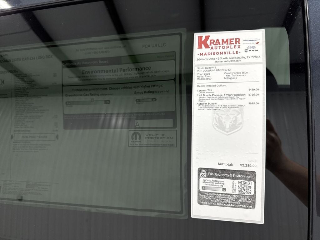 Ready to work and built to last — this 2026 Ram 2500 Tradesman 4WD with the rugged 6-cylinder 6.7L diesel engine delivers unbeatable capability and value in Madisonville, TX. Powerful towing and impressive torque make this diesel-powered heavy-duty truck ideal for hauling trailers, equipment, or weekend toys, while the 4WD system provides confident traction on or off the beaten path. We're offering the best price on this Tradesman — exceptional savings for a truck loaded with features. Inside, modern convenience and tech meet utility: Android Auto keeps your apps and hands-free calling within easy reach, and Navigation helps you get where you're headed efficiently. Automatic Climate Control maintains a comfortable cabin for every jobsite and commute. The Off-Road Package enhances capability with rugged suspension and protective equipment for tougher terrain, and Rear Parking Sensors make maneuvering and hitching a trailer simpler and safer. This Tradesman is purpose-built for businesses and drivers who demand durability without sacrificing comfort. With a commanding 6.7L diesel heart, proven Ram engineering, and a feature set designed to tackle both work and leisure, it's a smart buy for Madisonville drivers who want the best price on a capable heavy-duty truck. Contact us to schedule a test drive and see why this 2026 Ram 2500 Tradesman is the top value in town.