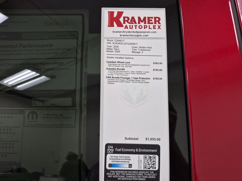 Tradesman Level 1 Equipment Group: Google Android Auto; SiriusXM Radio Service; For Details. Visit DriveUconnect.com; For More Info. Call 800-643-2112; Integrated Voice Command with Bluetooth®; Emergency Vehicle Alert System (EVAS); Manual Folding Exterior Mirrors; 12" Touchscreen Display; Auto Power-Folding Mirrors; 4 Way Front Headrests; Front Armrest with Cupholders; Anti-Spin Differential Rear Axle; Remote USB Port - Charge Only; Manual Adjust 4-Way Front Passenger Seat; Mirror Running Lights; Exterior 115V AC Outlet; Alexa Built-In; Apple CarPlay; Power-Adjustable Convex Aux Mirrors; Forward and Reverse Utility Lights; Cloth 40/20/40 Bench Seat; Disassociated Touchscreen Display; Storage Tray; 115-Volt Auxiliary Front Power Outlet; Rear View Auto Dim Mirror; 40/20/40 Split Bench Seat; Rear Power Sliding Window; Connectivity - US/Canada; Rear Folding Seat; Tinted Acoustic Windshield Glass; GPS Navigation; 4G LTE Wi-Fi Hot Spot; GPS Antenna Input; Exterior Mirrors with Heating Element; MOPAR Black Tubular Side Steps; SiriusXM with 360L; Global Telematics Box Module; Connected Travel and Traffic Services; Black Exterior Mirrors; 2 Way Rear Headrest Seat; Carpet Floor Covering; Off-Road Info Pages; Selectable Tire Fill Alert; Trailer Tow Pages; 400W Inverter; HD Radio; Power Heated Folding Telescope Mirrors; Uconnect 5 Navigation with 12.0" Display Radio; Exterior Mirrors with Supplemental Signals; Exterior Mirrors Courtesy Lamps; Air Conditioning ATC with Dual Zone Control; Manual Adjust 4-Way Driver Seat; Manual Telescoping Mirrors; Power Adjust Mirrors; Power Telescoping Mirrors; Front and Rear Floor Mats; ParkSense Front/rear Park Assist System. Convenience Group. Bed Convenience Group: MOPAR Spray in Bedliner; LED Bed Lighting. Quick Order Package 2UA Tradesman. 5th Wheel/gooseneck Towing Prep Group. MOPAR Black Tubular Side Steps. Anti-Spin Differential Rear Axle. Cloth 40/20/40 Bench Seat. 18" X 8.0" Black Painted Steel Wheels. Molten Red Pearlcoat. Rear Wheelhouse Liners. Clearance Lamps. **Equipment listed is based on original vehicle build and subject to change. Please confirm the accuracy of the included equipment by calling the dealer prior to purchase.**