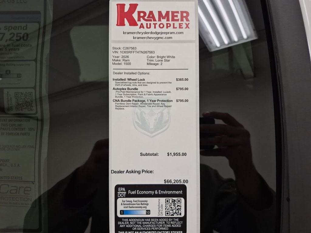 Drive home in confidence with this 2026 Ram 1500 Lone Star 4WD — a bold, capable pickup ready for work and weekend adventures in Livingston, TX. Powered by a robust V8 5.7L gasoline engine, this Ram delivers impressive towing and hauling performance while maintaining a refined, comfortable cabin that fits family life and job-site demands. The Lone Star trim balances rugged capability with modern convenience, and this truck is priced to move — the best price in the area. Inside, enjoy cold-weather comfort with a heated steering wheel that keeps your hands warm on chilly mornings. Stay connected and entertained with Apple CarPlay, hands-free Bluetooth®, and satellite radio for long drives across Texas. Safety and ease are standard with a back-up camera to simplify parking and trailer hookups. Thoughtful features and intuitive tech make daily driving effortless. This 4WD Ram 1500 Lone Star is ideal for anyone seeking dependable performance, smart technology, and genuine value. Whether navigating country roads, towing trailers, or heading into town, this truck is built to perform. Located in Livingston, TX, and offered at the best price, it won't last long. Schedule a test drive today to experience the power, comfort, and capability of this 2026 Ram 1500 Lone Star 4WD with the V8 5.7L engine — a top choice for Texas drivers who demand more from their truck.