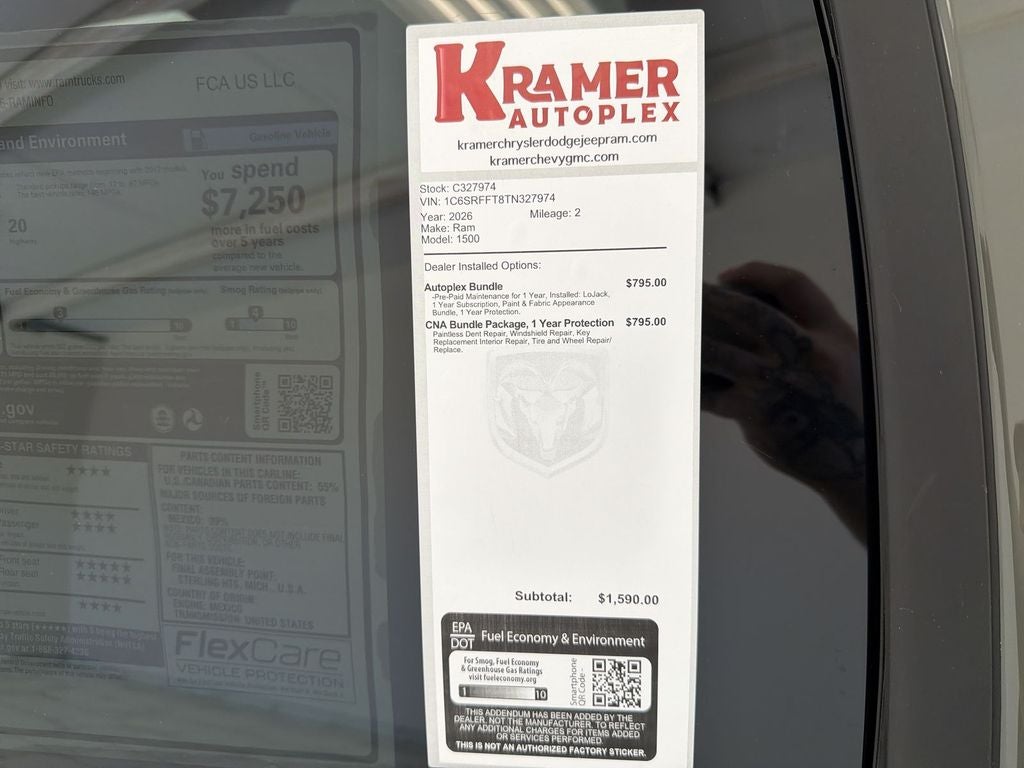 This model has automated speed control that adjusts to maintain a safe following distance, enhancing highway driving convenience. Bluetooth® technology is built into the Ram 1500, keeping your hands on the steering wheel and your focus on the road. The installed navigation system will keep you on the right path. An off-road package is installed on this Ram 1500 so you are ready for your four-wheeling best. This Ram 1500 offers Android Auto for seamless smartphone integration. Keep your hands warm all winter with a heated steering wheel in this 1/2 ton pickup . This model offers Apple CarPlay for seamless connectivity. Start the Ram 1500 from inside with remote start. This Ram 1500's Forward Collision Warning feature alerts drivers to potential front-end collisions. See what's behind you with the back up camera on the vehicle. This Ram 1500 keeps you comfortable with Auto Climate. This 2026 Ram 1500 is equipped with the latest generation of XM/Sirius Radio.