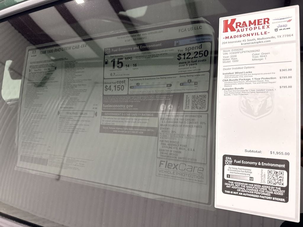 Experience the 2026 Ram 1500 RHO 4WD — a powerful blend of capability, comfort, and cutting-edge tech located in Madisonville, TX. Powered by a refined 6‑cylinder 3.0L gasoline engine, this Ram delivers smooth acceleration, impressive towing potential, and efficiency for daily drives or weekend hauls. Carefully engineered 4WD handles Texas weather and off‑road challenges with confidence, while a responsive suspension keeps the ride composed whether on pavement or dirt. Step inside to premium comfort and convenience: a heated steering wheel for chilly mornings, intuitive navigation to get you where you're going, and a premium sound system that transforms every drive into a concert. Hands-free Bluetooth® connectivity keeps calls and media simple and safe, and the back-up camera provides clear rear visibility for parking and hitching trailers. This Ram 1500 RHO combines bold exterior presence with a thoughtfully designed interior and advanced features tailored for modern drivers. With safety, technology, and performance all prioritized, it's an exceptional choice for those who demand capability without sacrificing comfort. Located in Madisonville, TX, this 2026 Ram 1500 RHO 4WD is priced to move — offering the best value in the area. Don't miss your chance to own a feature-rich, well-equipped pickup that stands out in capability, comfort, and price. Schedule a test drive today.