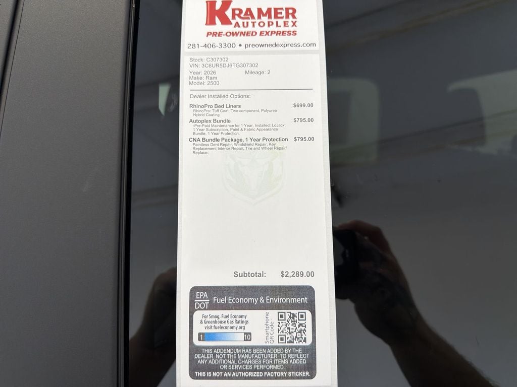 This vehicle is pure luxury with a heated steering wheel. Never get into a cold vehicle again with the remote start feature on this model. The rear parking assist technology on this unit will put you at ease when reversing. The system alerts you as you get closer to an obstruction. This 3/4 ton pickup's Forward Collision Warning system alerts the driver to potential front-end collisions, enhancing safety. Enjoy the heated seats in the vehicle you will never buy a vehicle without them. Everyone loves the comfort of having a warm seat on those cold winter days. Bluetooth® technology is built into it, keeping your hands on the steering wheel and your focus on the road. This 3/4 ton pickup comes equipped with Android Auto for seamless smartphone integration on the road. This vehicle offers Automatic Climate Control for personalized comfort. See what's behind you with the back up camera on this 2026 Ram 2500 .