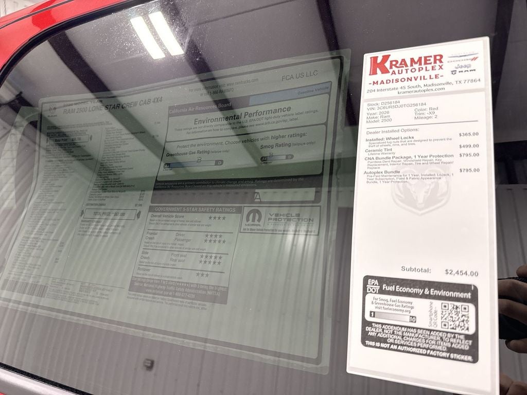 Power, capability, and comfort come together in this 2026 Ram 2500 Lone Star 4WD with the potent V8 6.4L gasoline engine — the ultimate choice for drivers in Madisonville, TX seeking the best price on a heavy-duty truck. Built to tow, haul, and conquer rough terrain, this Lone Star features a rugged Off-Road Package that adds enhanced suspension, skid protection, and confidence when the pavement ends. Advanced Navigation keeps you on course whether you're heading out of town or navigating construction zones, while Apple CarPlay and Hands-Free Bluetooth® deliver seamless smartphone integration for music, calls, and directions. Step inside to appreciate heated seats that make chilly mornings comfortable and a thoughtfully designed cabin that balances durability with convenience. The commanding V8 6.4L provides exceptional low-end torque for towing trailers and equipment, and 4WD capability ensures traction in mud, snow, and uneven surfaces. This Ram 2500 Lone Star is priced to move — located in Madisonville, TX — and represents the best price for a truck of this caliber in the region. Perfect for contractors, weekend adventurers, and anyone who demands reliability and performance, this Ram 2500 Lone Star combines modern tech, off-road readiness, and heavy-duty capability. Schedule a test drive today in Madisonville, TX and experience why this is the best-priced 2026 Ram 2500 Lone Star 4WD V8 6.4L on the market.