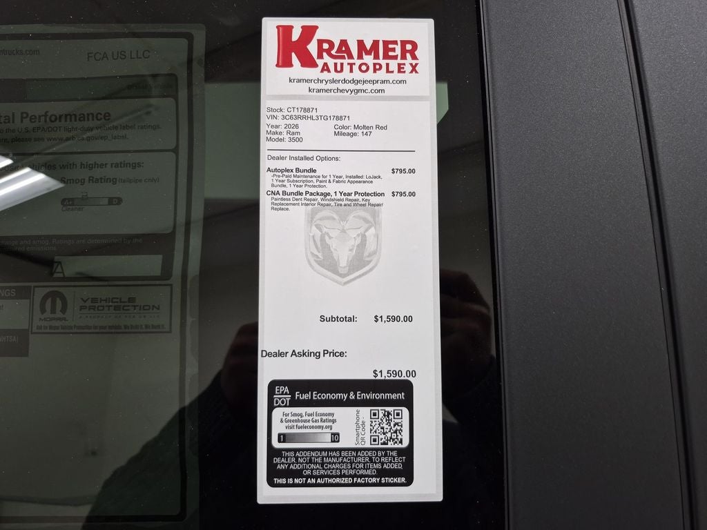 Big Horn Level 2 Equipment Group: Blind Spot and Cross Path Detection; Rear View Auto Dim Mirror; Power Adjustable Pedals; Rear Power Sliding Window; Rear Dome with On/off Switch Lamp; Lone Star Instrument Panel Badge; Glove Box Lamp; Auto Power-Folding Mirrors; Footwell Courtesy Lamp; Exterior Mirrors with Heating Element; Heated Front Seats; Mirror Running Lights; Heated Steering Wheel; Foam Bottle Insert (door Trim Panel); Black Exterior Mirrors; Exterior 115V AC Outlet; Dampened Tailgate; Premium Cloth Bucket Seats; Power-Adjustable Convex Aux Mirrors; Forward and Reverse Utility Lights; Locking Lower Glove Box; Remote Start System; 400W Inverter; 9 Alpine Speakers with Subwoofer; Power Heated Fold Telescopic Mirrors; Dual Wireless Charging Pad; Exterior Mirrors with Supplemental Signals; Steering Wheel Mounted Audio Controls; Exterior Mirrors Courtesy Lamps; Dual Glove Boxes; 115-Volt Auxiliary Front Power Outlet; Cluster 7.0" TFT Color Display; Universal Garage Door Opener; Power Adjust Mirrors; Luxury Steering Wheel; 2nd Row in Floor Storage Bins; Power Telescoping Mirrors; Sun Visors with Illuminated Vanity Mirrors. Quick Order Package 24Y Lone Star: Lone Star Badge. Dual Rear Wheels: Clearance Lamps; LT235/80R17E BSW All Season Tires; 17" Steel Spare Wheel; Box and Rear Fender Clearance Lamps; Center Hub; 6000# Front Axle with Hub Extension; 17" X 6.0" Polished Aluminum Wheels; Nexen Brand Tires; 14. 000 Lb GVWR; Rear Wheelhouse Liners. Quick Order Package 2UY Lone Star: Lone Star Badge. Blind Spot and Cross Path Detection. Premium Cloth Bucket Seats. 50 Gallon Fuel Tank. Remote Start System. Molten Red Pearlcoat. Instrument Panel Mounted Auxiliary Switches. MOPAR Front and Rear Rubber Floor Mats. Rear Wheelhouse Liners. Clearance Lamps. Power 2-Way Driver Lumbar Adjust. **Equipment listed is based on original vehicle build and subject to change. Please confirm the accuracy of the included equipment by calling the dealer prior to purchase.**