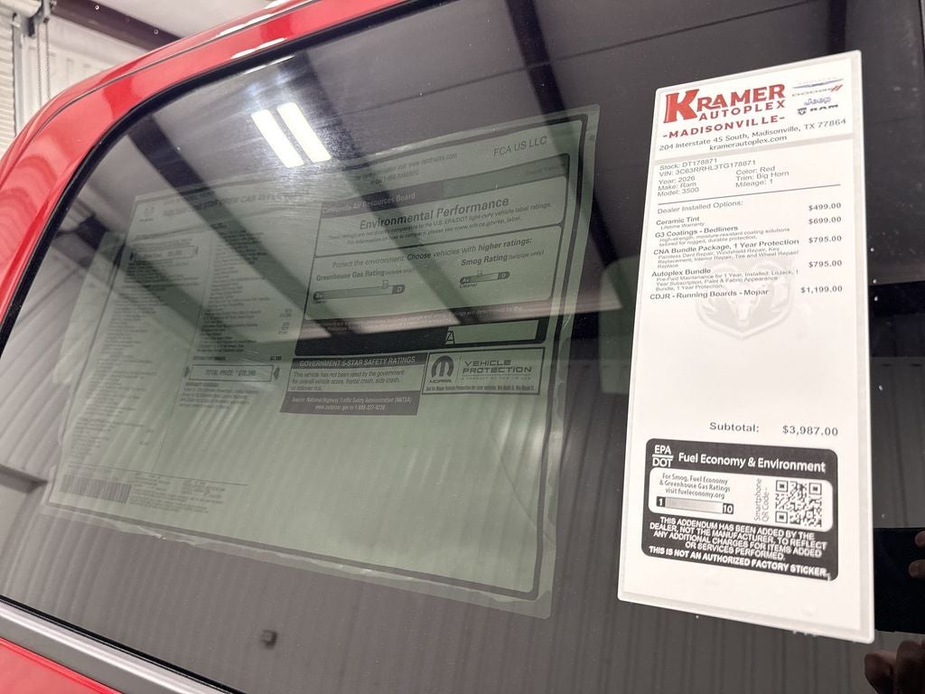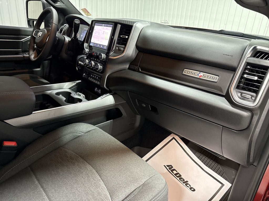 Big Horn Level 2 Equipment Group: Blind Spot and Cross Path Detection; Rear View Auto Dim Mirror; Power Adjustable Pedals; Rear Power Sliding Window; Rear Dome with On/off Switch Lamp; Lone Star Instrument Panel Badge; Glove Box Lamp; Auto Power-Folding Mirrors; Footwell Courtesy Lamp; Exterior Mirrors with Heating Element; Heated Front Seats; Mirror Running Lights; Heated Steering Wheel; Foam Bottle Insert (door Trim Panel); Black Exterior Mirrors; Exterior 115V AC Outlet; Dampened Tailgate; Premium Cloth Bucket Seats; Power-Adjustable Convex Aux Mirrors; Forward and Reverse Utility Lights; Locking Lower Glove Box; Remote Start System; 400W Inverter; 9 Alpine Speakers with Subwoofer; Power Heated Fold Telescopic Mirrors; Dual Wireless Charging Pad; Exterior Mirrors with Supplemental Signals; Steering Wheel Mounted Audio Controls; Exterior Mirrors Courtesy Lamps; Dual Glove Boxes; 115-Volt Auxiliary Front Power Outlet; Cluster 7.0" TFT Color Display; Universal Garage Door Opener; Power Adjust Mirrors; Luxury Steering Wheel; 2nd Row in Floor Storage Bins; Power Telescoping Mirrors; Sun Visors with Illuminated Vanity Mirrors. Quick Order Package 24Y Lone Star: Lone Star Badge. Dual Rear Wheels: Clearance Lamps; LT235/80R17E BSW All Season Tires; 17" Steel Spare Wheel; Box and Rear Fender Clearance Lamps; Center Hub; 6000# Front Axle with Hub Extension; 17" X 6.0" Polished Aluminum Wheels; Nexen Brand Tires; 14. 000 Lb GVWR; Rear Wheelhouse Liners. Quick Order Package 2UY Lone Star: Lone Star Badge. Blind Spot and Cross Path Detection. Premium Cloth Bucket Seats. 50 Gallon Fuel Tank. Remote Start System. Molten Red Pearlcoat. Instrument Panel Mounted Auxiliary Switches. MOPAR Front and Rear Rubber Floor Mats. Rear Wheelhouse Liners. Clearance Lamps. **Equipment listed is based on original vehicle build and subject to change. Please confirm the accuracy of the included equipment by calling the dealer prior to purchase.**