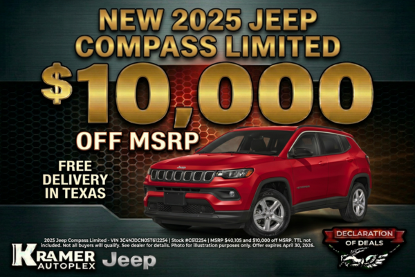 2025 Jeep Compass Limited - VIN 3C4NJDCN0ST612254 | Stock #C612254 | MSRP $40,105 and $10,000 off MSRP. TTL not included. Not all buyers will qualify. See dealer for details. Photo for illustration purposes only. Offer expires April 30, 2026.