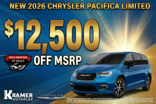 2026 Chrysler Pacifica Limited - VIN 2C4RC1GG1TR223830 | Stock #D223830 | MSRP $54,505 and $12,500 off MSRP. Qualified buyers can finance at 0% APR for 60 months. Discount or APR. TTL not included. Not all buyers will qualify. See dealer for details. Photo for illustration purposes only. Offer expires March 31, 2026.