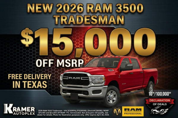 2026 RAM 3500 Tradesman - VIN 3C63RPGL3TG295081 | Stock #C295081 | MSRP $74,465 and $15,000 off MSRP. TTL not included. Not all buyers will qualify. See dealer for details. Photo for illustration purposes only. Offer expires April 30, 2026.