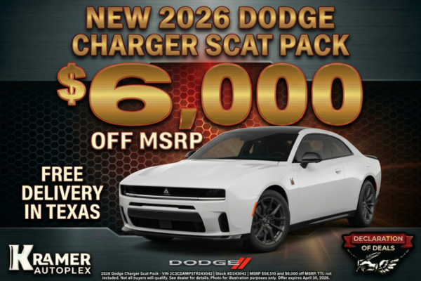 2026 Dodge Charger Scat Pack - VIN 2C3CDAMP5TR243042 | Stock #D243042 | MSRP $58,510 and $6,000 off MSRP. TTL not included. Not all buyers will qualify. See dealer for details. Photo for illustration purposes only. Offer expires April 30, 2026.