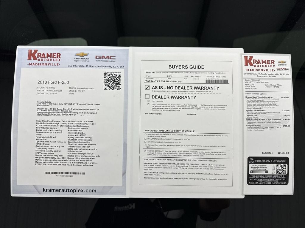 Snow Plow Prep Package: Extra Heavy-Duty 200 Amp Alternator. Order Code 603A: AM/FM stereo/single-CD/MP3 Player Radio; Cloth 40/20/40 Split Bench Seat; 10. 000 Lb Payload Package GVWR; 18" Sparkle Silver Painted Cast Aluminum Wheels. Ford Telematics Powered by Telogis. LT275/70Rx18E BSW A/T (4) Tires. Exterior Backup Alarm. **Equipment listed is based on original vehicle build and subject to change. Please confirm the accuracy of the included equipment by calling the dealer prior to purchase.**