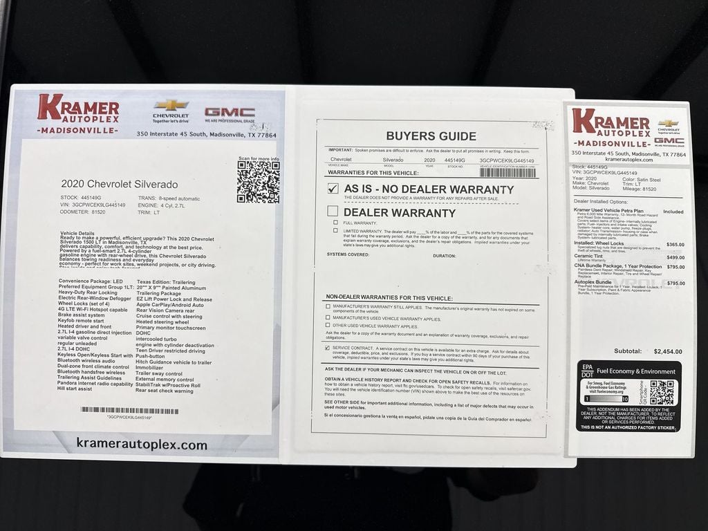 For sale in Madisonville, TX: a well-maintained 2020 Chevrolet Silverado 1500 LT with rear-wheel drive and a fuel-efficient 4-cylinder 2.7L gasoline engine. This Chevrolet Silverado blends capability and comfort, offering a smooth ride for daily driving and confident handling when towing or hauling. We offer the best price on this popular, versatile pickup - a smart value for buyers seeking dependability without overspending.