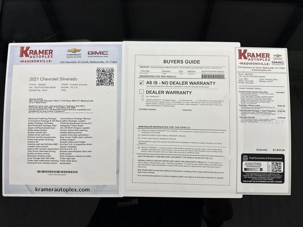 Ready for work, play, and everything in between, this 2021 Chevrolet Silverado 1500 LT Trail Boss with 4WD and the powerful 5.3L V8 gasoline engine delivers capability and confidence on every drive. Located in Madisonville TX, this rugged Chevrolet Silverado Trail Boss blends aggressive styling, off-road-ready suspension, and towing strength with modern convenience features that make daily driving a pleasure.