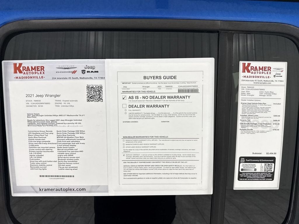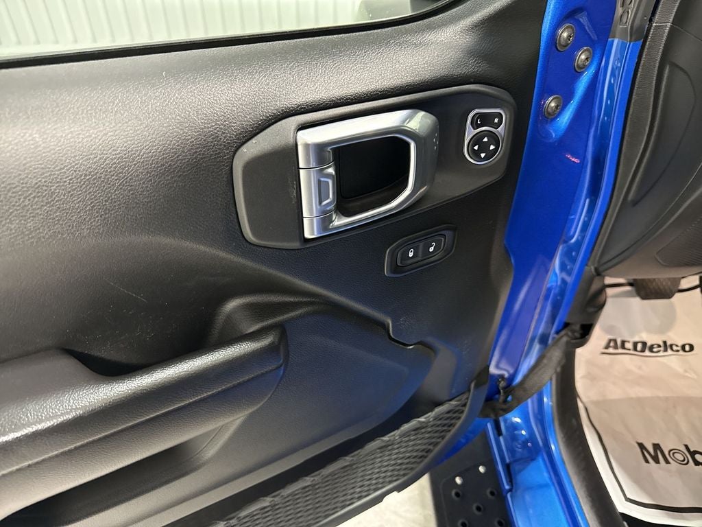Convenience Group: Remote Start System; Universal Garage Door Opener. Quick Order Package 25W Willys (disc): Willys; Mold in Color Bumper with Gloss Black; Speed Sensitive Power Locks; Automatic Headlamps; Leather Wrapped Steering Wheel; Deep Tint Sunscreen Windows; Black Trail Rated Badge; 4-Wheel Drive Swing Gate Decal; Black Grille; MOPAR All-Weather Floor Mats; Willys Hood Decal; Rock Protection Sill Rails; LT255/75R17C Tires; Front 1-Touch Down Power Windows; Anti-Spin Differential Rear Axle; Power Heated Mirrors; Wrangler Decal; Matte Black Jeep Badge; Security Alarm; 17" X 7.5" Moab Black Aluminum Wheels; Remote Keyless Entry; Sun Visors with Illuminated Vanity Mirrors. LED Headlamp and Fog Lamp Group: Front LED Fog Lamps; LED Premium Reflector Headlamps. Quick Order Package 23W Willys: Willys; Mold in Color Bumper with Gloss Black; Speed Sensitive Power Locks; Automatic Headlamps; Leather Wrapped Steering Wheel; Deep Tint Sunscreen Windows; Black Trail Rated Badge; 4-Wheel Drive Swing Gate Decal; Black Grille; MOPAR All-Weather Floor Mats; Willys Hood Decal; Rock Protection Sill Rails; LT255/75R17C Tires; Front 1-Touch Down Power Windows; Anti-Spin Differential Rear Axle; Power Heated Mirrors; Wrangler Decal; Matte Black Jeep Badge; Security Alarm; 17" X 7.5" Moab Black Aluminum Wheels; Remote Keyless Entry; Sun Visors with Illuminated Vanity Mirrors. Black 3-Piece Hard Top. Hydro Blue Pearlcoat. Hydro Blue Pearlcoat. MOPAR All-Weather Floor Mats. **Equipment listed is based on original vehicle build and subject to change. Please confirm the accuracy of the included equipment by calling the dealer prior to purchase.**