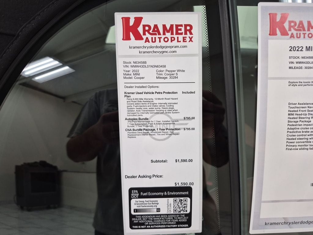 Driver Assistance Package: Parking Assistant; Active Cruise Control. Iconic Trim: 7-Speed Sport Dual Clutch Transmission; Storage Package; Heated Front Seats; Convertible Wind Deflector; Auto-Dimming Rearview Mirror; Comfort Access Keyless Entry; Harman/kardon Premium Sound System; Body Color Mirror Caps; Power-Folding Mirrors; 18" X 8.0" MINI Yours British Spoke 2-Tone Wheels; Heated Steering Wheel; Dual Zone Auto Climate Control; Universal Garage-Door Opener; Nappa Leather Steering Wheel; All-Season Tires. Touchscreen Navigation Plus: ConnectedDrive Services; Media Display; Dynamic Digital Instrument Cluster; Advanced Real-Time Traffic Information; Concierge Services; Apple CarPlay Compatibility; Remote Services; MINI Navigation; MINI Connected; MINI Assist ECall; MINI Head-Up Display; MINI TeleServices; MINI Connected XL; Wireless Charging. Harman/kardon Premium Sound System. Heated Front Seats. Parking Assistant. MINI Head-Up Display. Pepper White. Heated Steering Wheel. Universal Garage-Door Opener. Storage Package. **Equipment listed is based on original vehicle build and subject to change. Please confirm the accuracy of the included equipment by calling the dealer prior to purchase.**