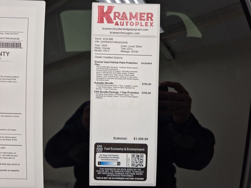The state of the art park assist system will guide you easily into any spot. It comes equipped with Android Auto for seamless smartphone integration on the road. Apple CarPlay: Seamless smartphone integration for the vehicle - stay connected and entertained on the go! The leather seats in this 2024 Honda CR-V are a must for buyers looking for comfort, durability, and style. This small suv has a clean CARFAX vehicle history report. This unit's Forward Collision Warning feature alerts drivers to potential front-end collisions. Good News! This certified CARFAX 1-owner vehicle has only had one owner before you. See what's behind you with the back up camera on this unit. It features a hands-free Bluetooth® phone system. This model has automated speed control that adjusts to maintain a safe following distance, enhancing highway driving convenience. This Honda CR-V keeps you comfortable with Auto Climate. Start this model from inside with remote start.