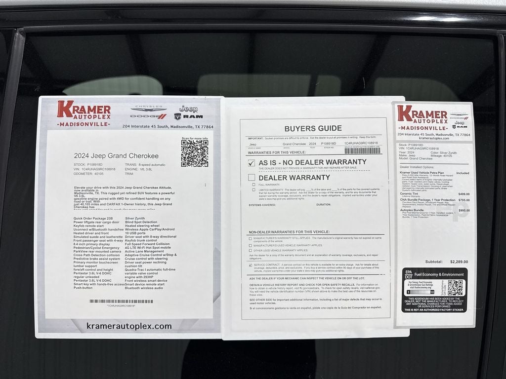 This vehicle represents the best price available in the area, combining value, reliability, and capability. Whether you're commuting, towing, or exploring off the beaten path, the Jeep Grand Cherokee Altitude delivers performance and peace of mind. Stop by in Madisonville, TX to test drive this well-equipped 2024 Jeep Grand Cherokee Altitude and see why it's an outstanding choice for drivers seeking quality and affordability. Financing and vehicle history report available upon request.